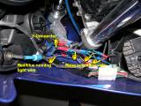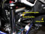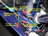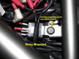 Connect the relay activation wire from the red/blue side light wire to the relay area. Run it along the fairing, under the voltage regulator and across to the relay area under the tank.