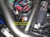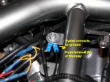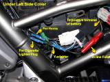 Extend the lead from the left side cover under the tank. Route it along existing wiring through the retaining clips. Make it long enough to route all the way to the front of the undertank area and curve back to clip into the relay. Attach a female spade connector to the end so it can plug directly into terminal 87 of the relay (see photos later below). The first two pictures are from the horns page. The next three show the cigarette lighter socket power wire run alongside the horns power wire.